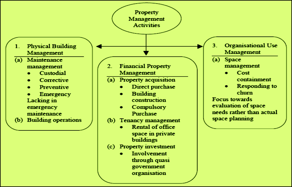 As stated in the Business Dictionary (2000), PM is the operation of property as a business, which necessitates the performance of the following two main tasks; namely: accounting and reporting, leasing, maintenance and repairs, paying taxes, provision of utilities and insurance, remodelling, rent setting and collection; and Property portfolio management tasks including acquisition and disposition, development and rehabilitation feasibility, financing and income tax accounting. PM focuses on the physical building management, financial property management and organisational use management.