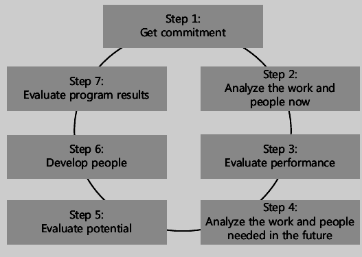 Step 6: Develop people: This step focuses on closing developmental gaps found by comparing the results of steps 4 and 5. To carry out this step successfully, organisational leaders should establish an individual development plan (IDP) for each employee to narrow gaps between what the individual does now and what he or she must do successfully in the future to function at higher levels of responsibility. An IDP is like a learning contract. It is usually negotiated between an individual and his or her supervisor on an annual basis. Individuals are encouraged to identify, and plan for using, resources to help them build the competencies they need at higher levels of responsibility. Resources may include training courses inside the organisation, seminars or conferences outside the organisation, internal job rotation experiences, and many other competency building efforts.